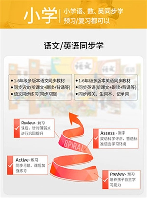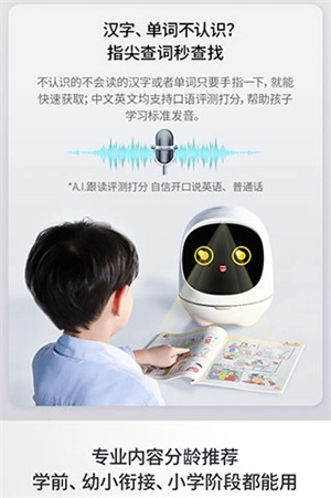 不认识的不会读的汉字或者单词只要手指一下,就能快速获取;中文英文均支持口语评测打分,帮助孩子学习标准发音。