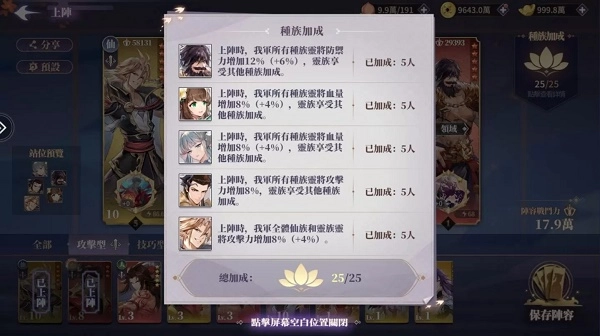 另外,《三界幻想启示录》里的四个种族在队伍组建方面独具特色。仙族培养难度偏大,然而成长上限极高,且擅长爆发输出;妖族能够迅速成型,拥有各类针对敌人的减益效果,适合新手在前期组建队伍;人族各方面较为均衡,擅长堆叠伤害,组建人族队伍需要着重追求较高的生存能力;灵族无论是体质还是技能都极为强大,只是数量稀少,难以单独成队。值得一提的是,若组队时队伍中所有角色为同一种族(灵族可与任何种族适配),还能额外获得40%的加成。