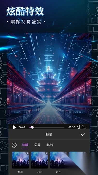 1、炫酷特效一键应用,视频动感吸引力UP,适合多场景使用。