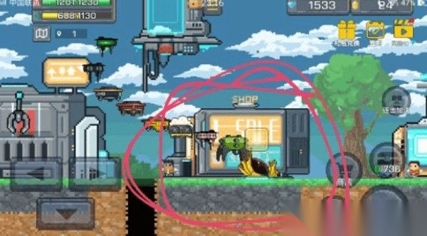 1、游戏场景中,从左至右建筑物依次为矿石交易所、维修站、商店、任务大厅;