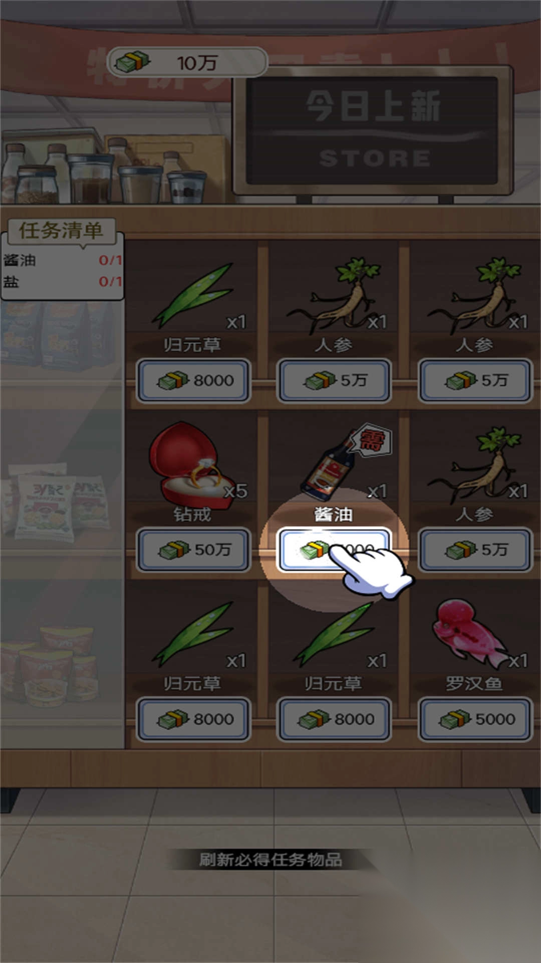 2、具备购物任务清单,同时存在刷新必定获得任务物品的机制,可按目标获取物品。