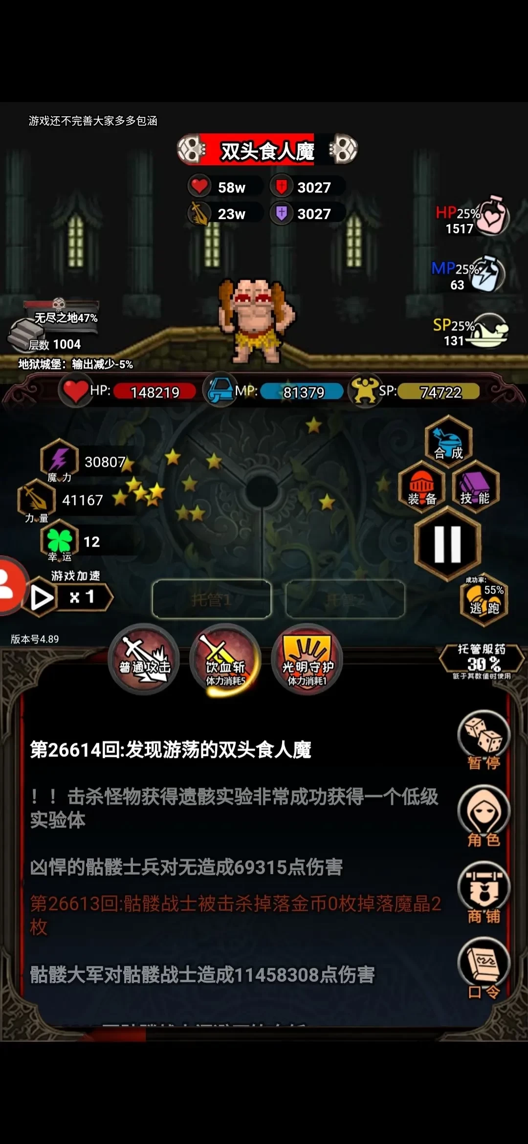 73、神行靴子+神行拳套+神行斗篷+神行影刀=神行幻影 逃跑率提升20%,逃跑失败70%免伤,逃跑成功五维提升3,逃跑成功或失败下次攻击都会增伤100%(可叠加) 50血 40体 40力 15魔