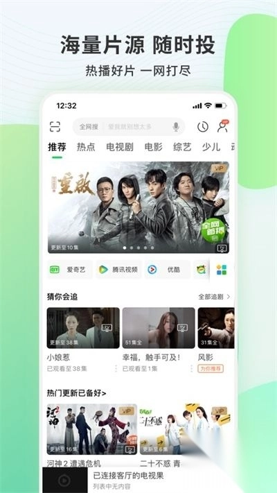 聚合全网视频内容,打造专属家庭影院,快速检索,一键投射至大屏幕。