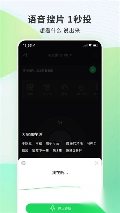 支持语音搜索热播综艺、影视大片、电视频道,说出想看的节目即可自动投屏。独家12项投屏功能(包括秘听、弹幕、倍速播放等)均可通过语音指令实现。