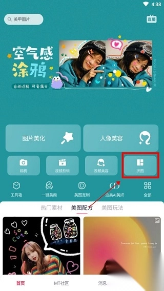 1、首先进入软件,拼图功能就在图中红框标出的位置中,点击进入会后,便可选择你手机的图片进行拼图啦!