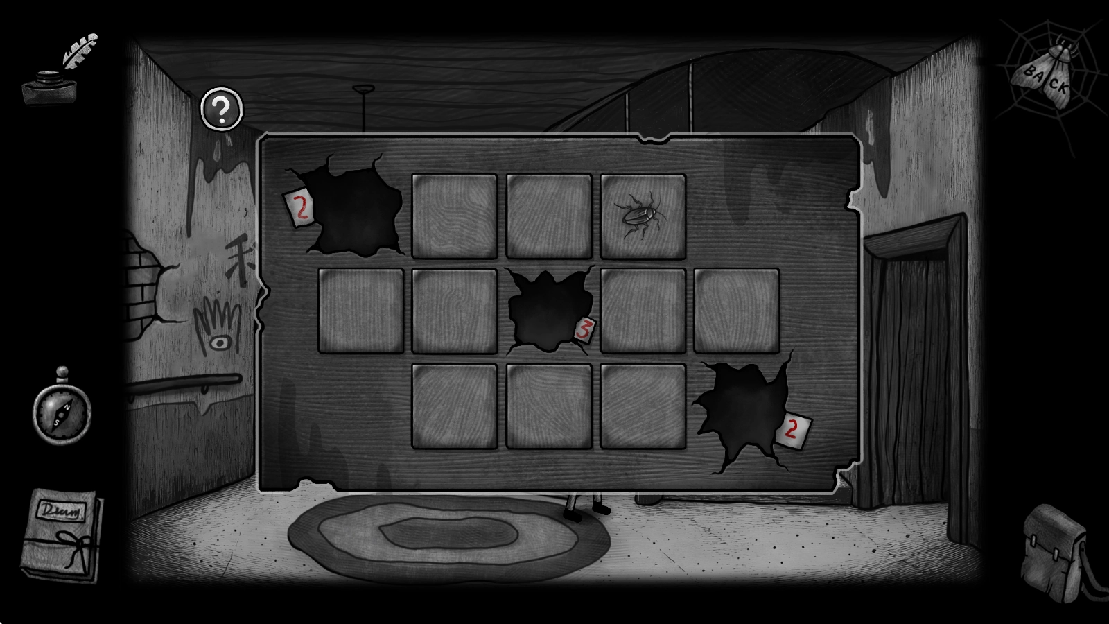 6、接着继续向前走,我们会进入一个房间,点击楼梯旁的柜子,就可以开启另一个小游戏。游戏规则就是点击蟑螂,让洞口旁的蟑螂数和洞口数字一致。