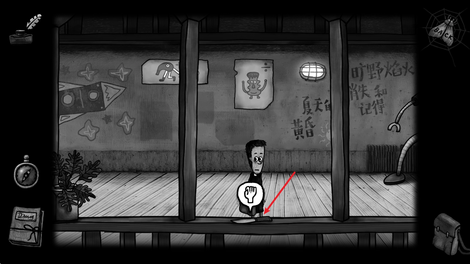5、在走廊上可以看到一把刀,靠近后拾取。