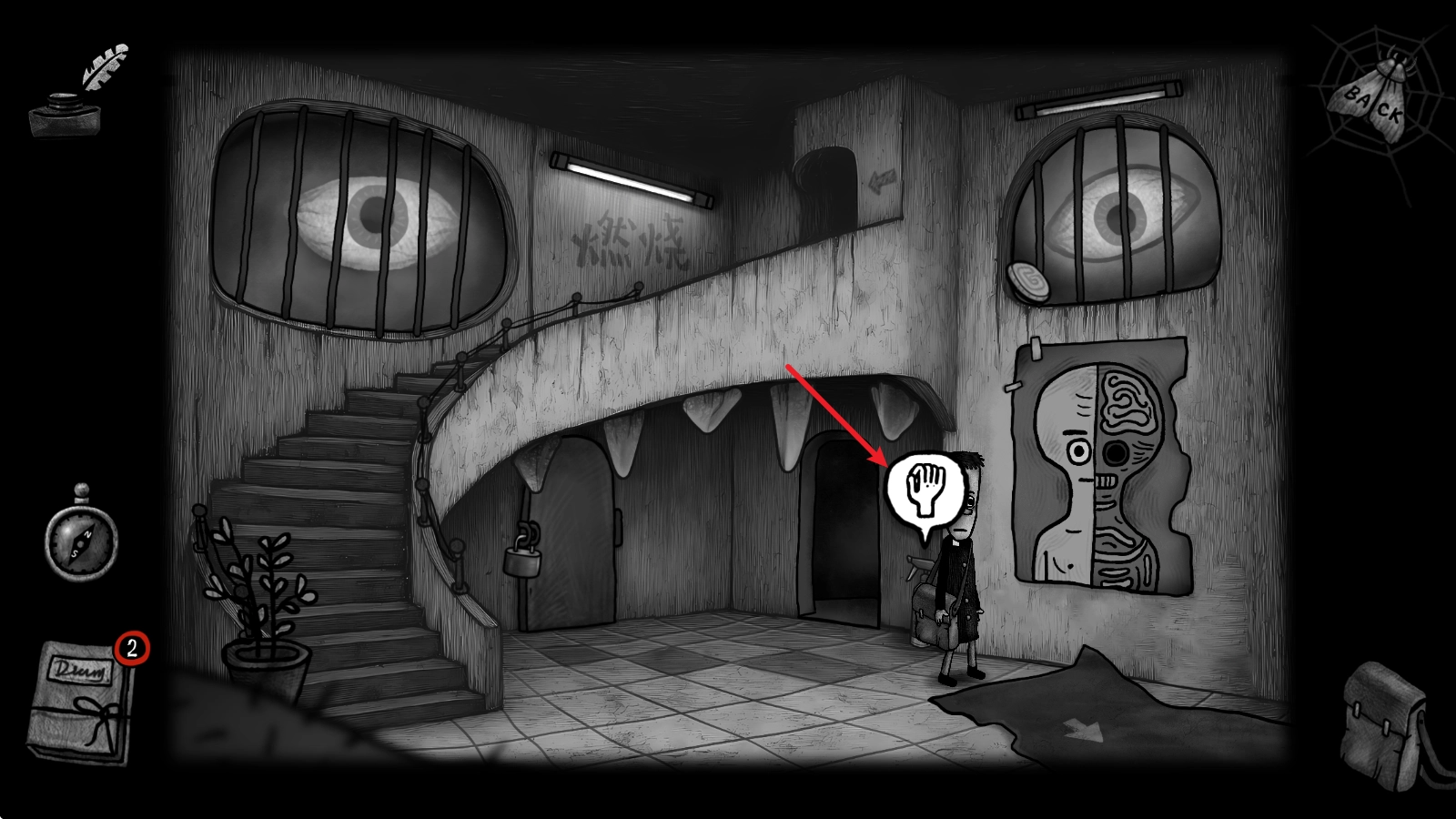 3、游戏采用黑白手绘风格,成功营造出浓郁的诡异氛围。从踏入游戏时大厅中央那对不停转动的眼球,到后续陆续出现的巨人模糊轮廓以及墙面上的手印,每一个视觉元素都在不断强化这种不安感。