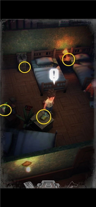2、可交互的物品会有光点闪烁,走到可交互的物品前会显示惊叹号,出现图上圈的标识时点击屏幕任意处可以触发交互。