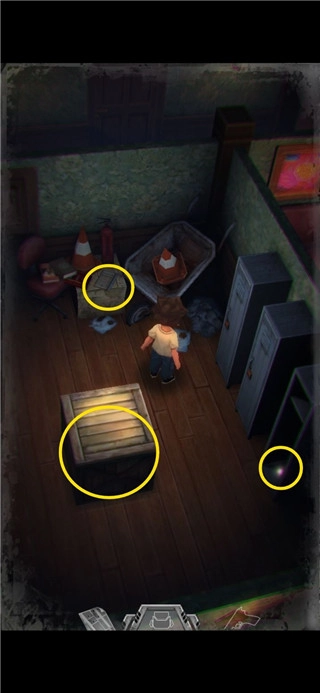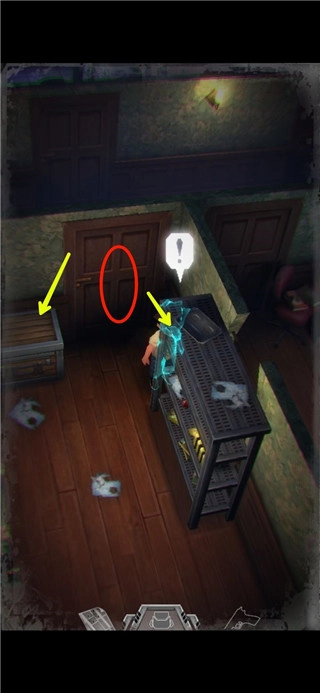 4、箱子属于储物箱,能够用来存放物品(由于男主背包容量有限,暂时用不着的东西可放入储物箱)。杂物间的门开启需要钥匙,已用红圈标注。来到图中所示位置,依照箭头指示方向,面向这个铁制置物架,松开后,长按屏幕任意地方,就能朝着男主所面对的方向推动物品,将架子推开后,从墙壁的空缺处进入另一个房间。