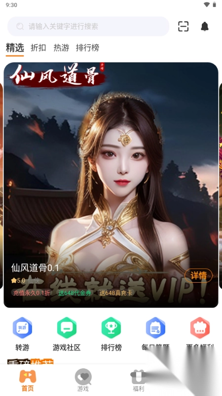 1. 丰富的折扣优惠:可为热门游戏提供低至0.1折的特惠版本,诸如经典传奇以及热门捕鱼等游戏皆在此列,玩家只需花费极少的费用,即可畅玩高品质游戏。 2. 全面的游戏类型:平台涵盖了各种各样类型的游戏,无论是热门品类,还是小众且富有特色的游戏,均能找寻到,能够满足各类玩家的需求。 3. 免费畅玩机制:所有游戏均可免费下载,玩家无需额外支出费用,可轻松获取喜爱的游戏,尽情体验游戏带来的乐趣。软件特色