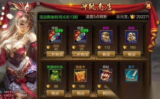建立角色前7日,每日均会开放一个冲级商店,在商店中除了能买到铜钱粮草等游戏资源外,还可以超低价值购买2份经验值。
