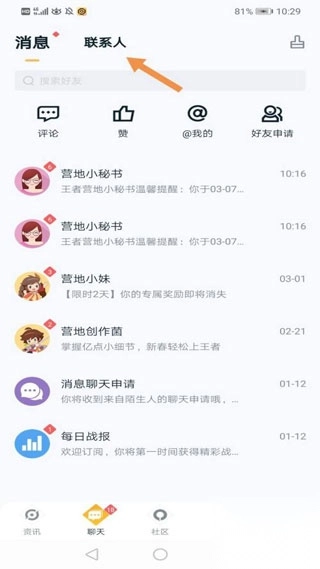 1. 开启王者营地的最新版本,轻点“聊天”选项。