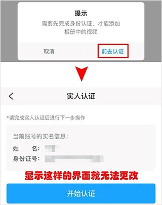 4、点了“上传相册视频”之后会有一个弹窗,这时候你再点“前去认证”就会打开一个新的界面,这时候重点就来了,如果你的界面和下方图示的界面一样,那就改不了,如果不一样,那就直接输入你要更改的实名信息然后点确定就可以了。