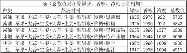 3、熬汤材料的鲜味、香味、浓度搭配数据: