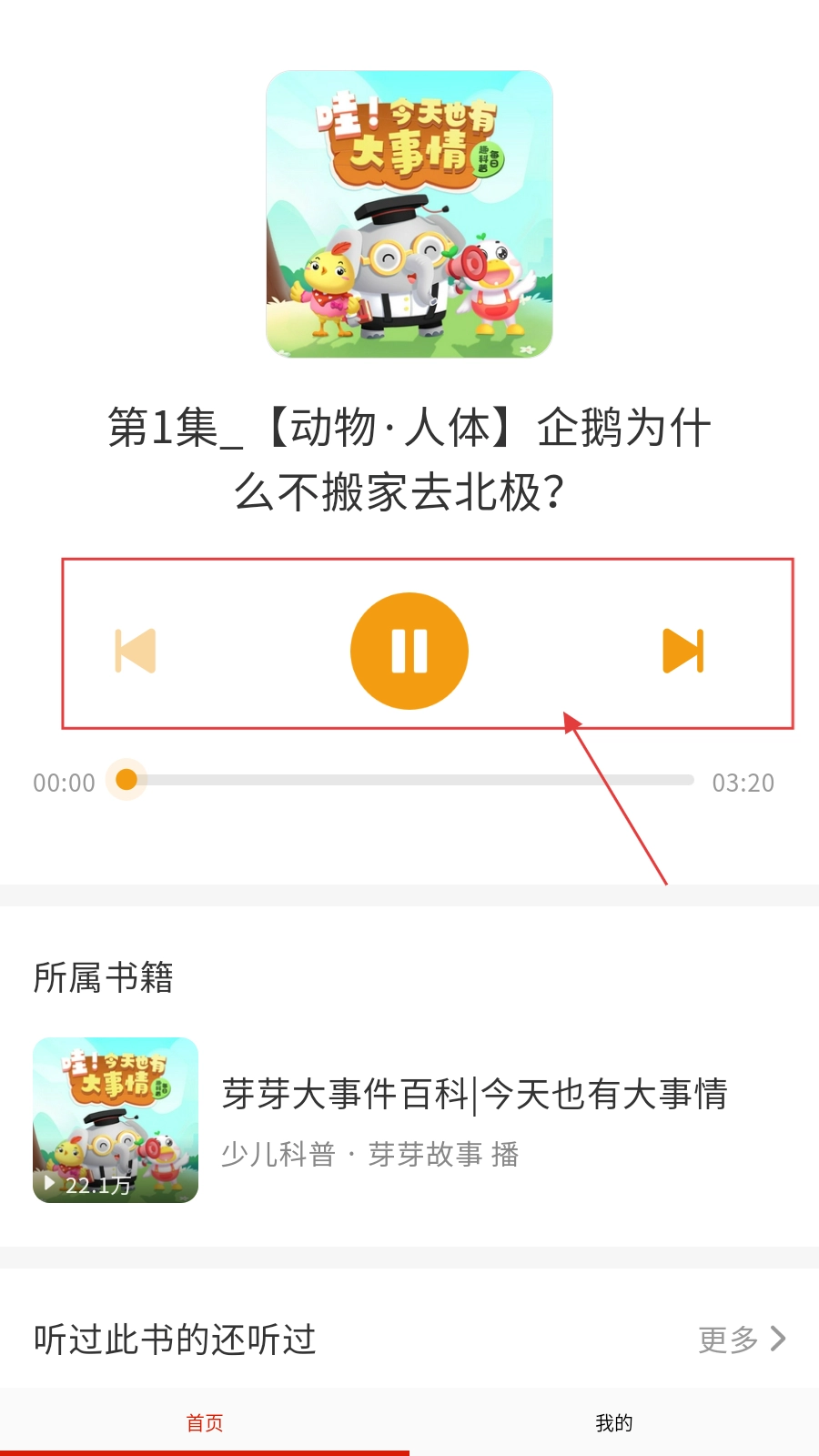 4、当你进入书籍播放页面后,便能执行播放、暂停以及切换等操作。快来和小朋友一同收听有趣的故事吧!