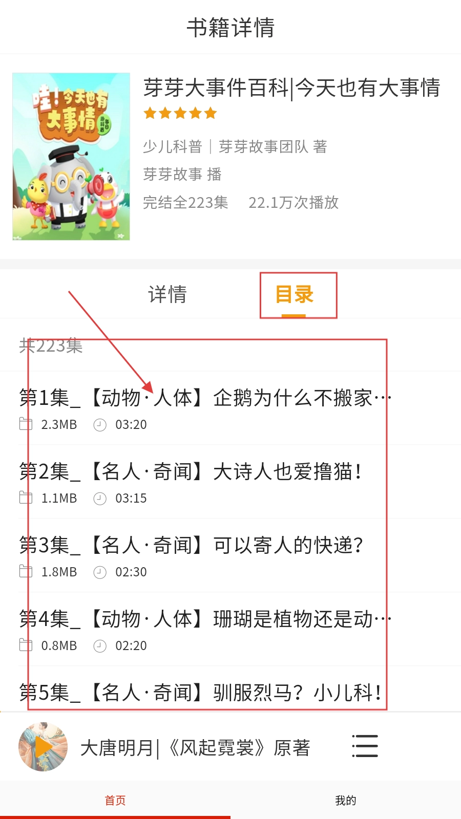 3、在【书籍详情】页,点击【目录】选择要听的集数并点击。