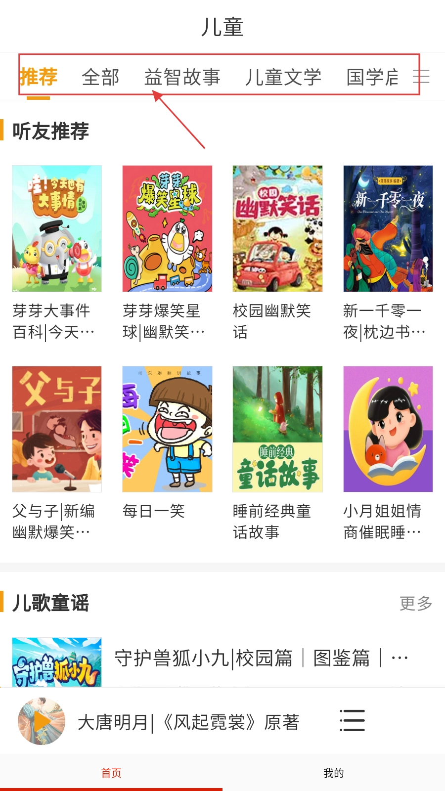 2、在【儿童】页面,有推荐、益智故事、儿童文学等。找到心仪的故事后点击进入。