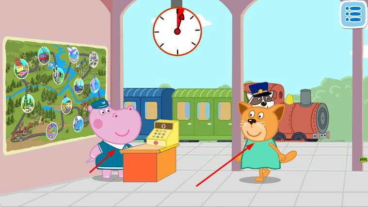 1、进入游戏,看到火车站场景,有角色和火车,点击相应的角色或区域,在火车站内,进行相关的互动操作,如购票。