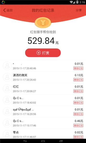 支持红包个数、金额统计。今日、昨日、历史抢到红包个数、金额,一目了然,随时分享战果。