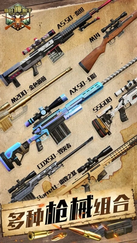 驰骋荒野狩猎,畅享多元枪械组合,搭配珍稀子弹,随心组装自由配件,一步步进阶为顶尖狙击手。