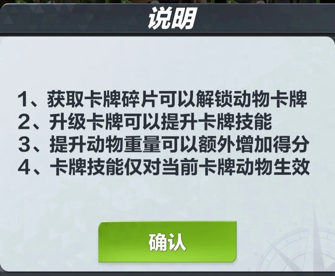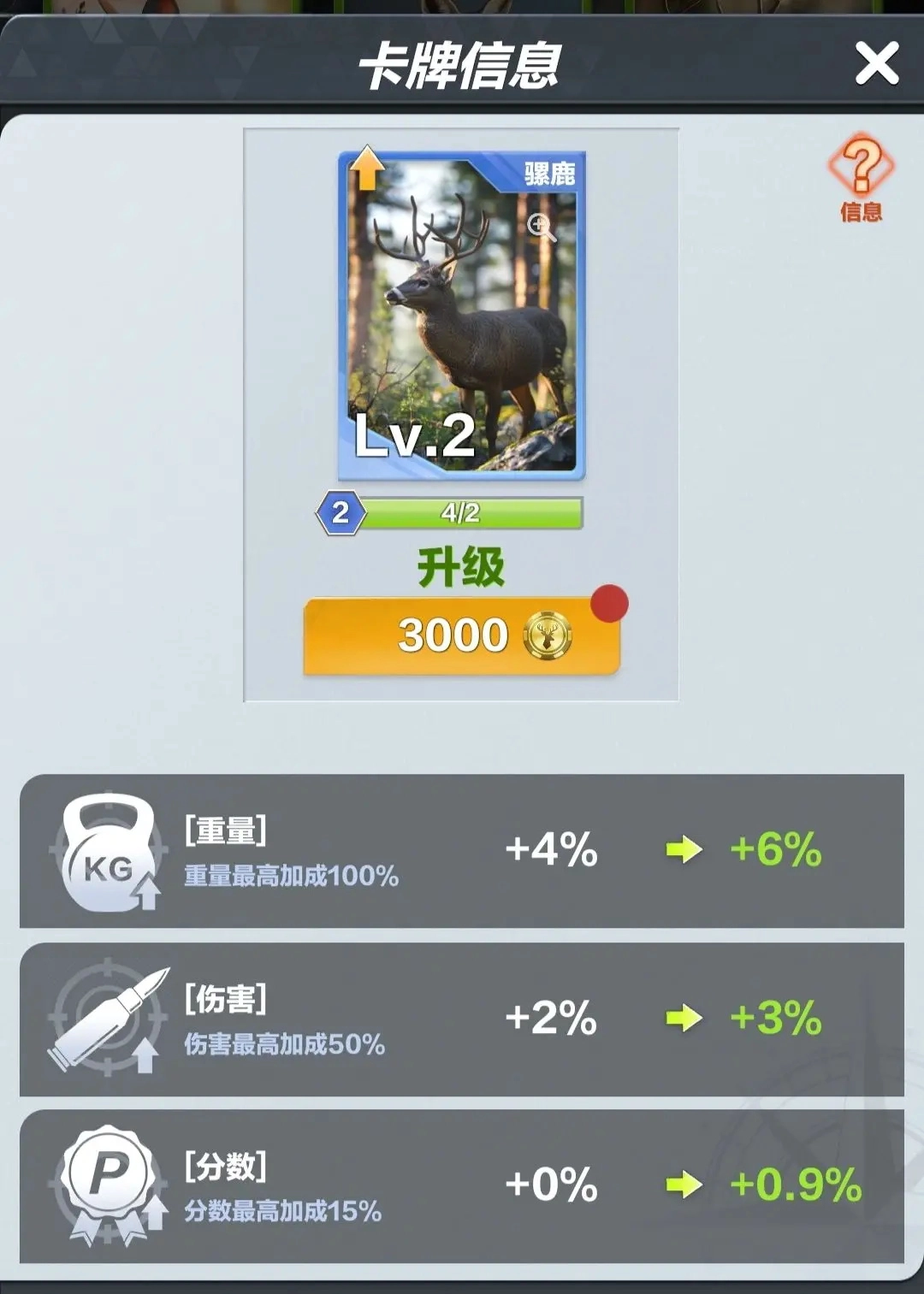 每次狩猎可获取卡牌碎片解锁动物卡牌,每张卡牌都有不同的卡牌加成能力,升级卡牌可以提升卡牌技能,在猎友们狩猎结束时能提供更多分数。