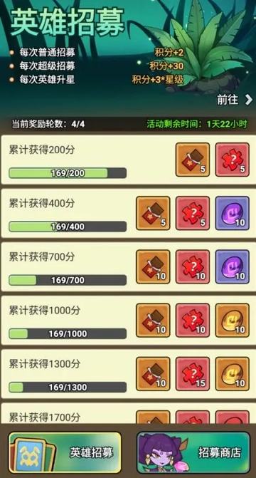 (开服前四天):一共四轮奖励,每个轮数2000积分,记住千万不要用钻石抽英雄(三遍). 白嫖完成一轮就可以,签到和主线任务以及地穴和主线推图给的招募卷可以够一轮奖励的,剩下的招募卷和英雄升星都下一轮招募再升~(奖励:招募卷,神话英雄碎片,精英,传说,神话琥珀)
