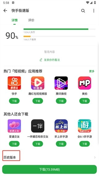2、接着在软件的详情页面,向上滑动至页面底部,之后点击【历史版本】。