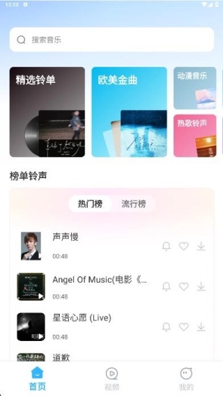 2、首页展示了精选铃单、欧美金曲、动漫音乐、热歌铃声等资源,也可以结合榜单铃声筛选。