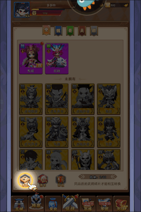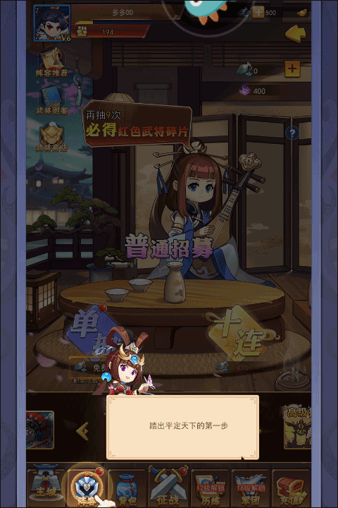 在该游戏中,玩家想要发展壮大的话,就需要招募到更多的武将和不断的挑战其他玩家,这样才能在三国中立足下来,并且这里的武将分为C、B、A、S,SS、SSS六种品质,品质越高,武将的基础属性越好,这样就能轻松的击败敌方了。