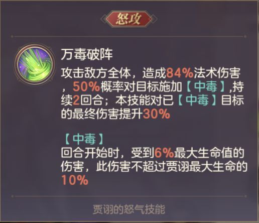 兵连祸结:贾诩与两名攻击型的武将上阵时,贾诩提升15%伤害;我方全体攻击型武将提升50%怒气降低抗性和异常状态,抗性持续三回合。