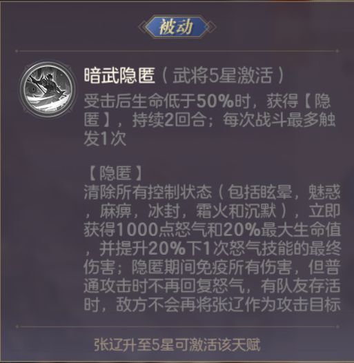 巧变破军:张郃与徐晃一起上阵时,张郃提升15%伤害,徐晃获得200点初始怒气。我方后排攻击敌方后排时最终伤害增加15%,我方前排受到对方后排伤害降低15%。