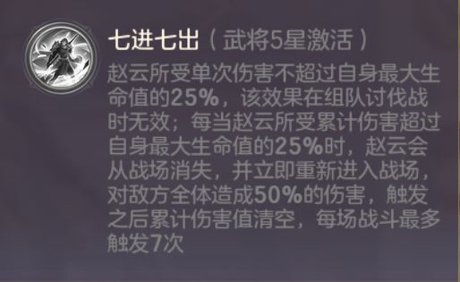 锦囊秘策:诸葛亮与赵云一起上阵,诸葛亮会提升15%的免伤,而赵云会获得三层锦囊效果,会使自身最终伤害降低20%,当效果消失时,诸葛亮会回复15%的最大生命值;赵云开局会获得20%的暴击率,三层锦囊效果会在第2.3.4回合开始触发,每触发时会回复300点怒气。