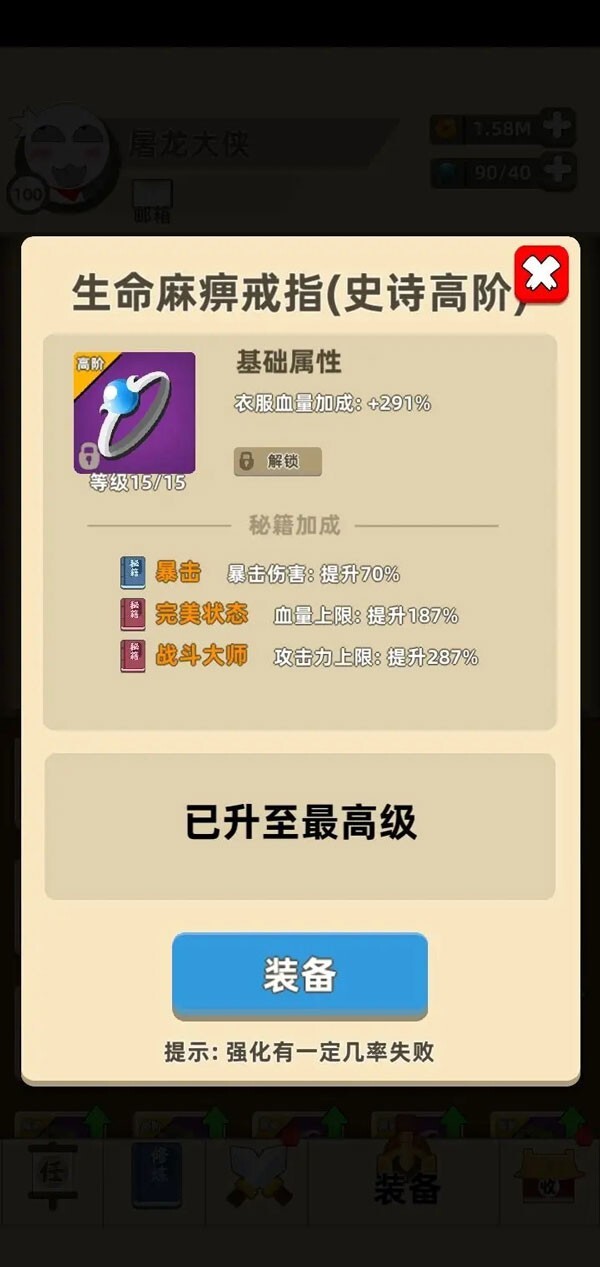 ④别小瞧内功升一级带来的加成,虽然单次加成看似不多,但叠加起来效果惊人。在还未获取传奇装备时,建议优先专注提升内功。而当你得到传奇装备后,就需要内功与装备同时兼顾提升。别舍不得那些金币,反正早晚都得花!