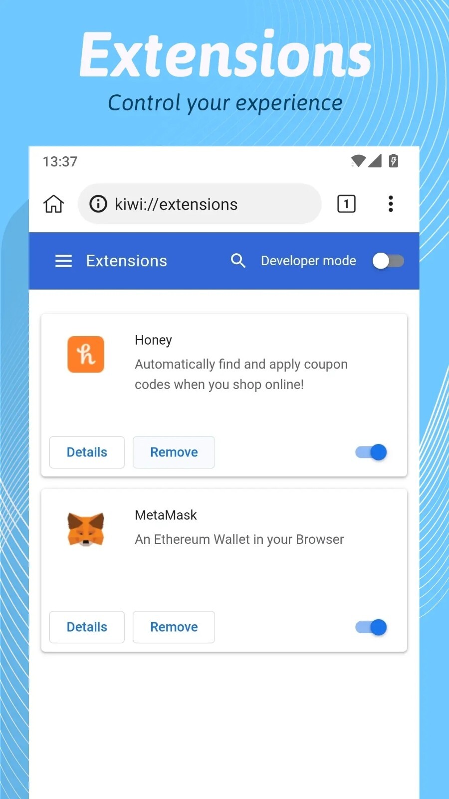 Kiwi浏览器app专注于为每一位用户带来流畅的网页浏览体验,帮助用户摆脱各类弹窗广告的困扰,营造更为纯净的浏览环境,同时支持用户自由拓展丰富多样的浏览器功能。