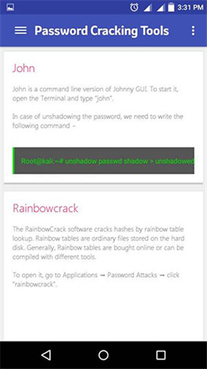 Kali Linux手机中文版具备丰富的教学内容,涵盖视频教程、文档资料以及实践案例等,使用户能够通过多样化途径深入研习Kali Linux的应用及相关技术。用户可依据自身学习进度与需求制定学习计划,并借助应用内的测试与练习巩固所学知识。与此同时,该软件持续更新内容,追踪最新的操作系统版本以及安全领域的动态,保证用户获取到最新且最全面的学习资源。