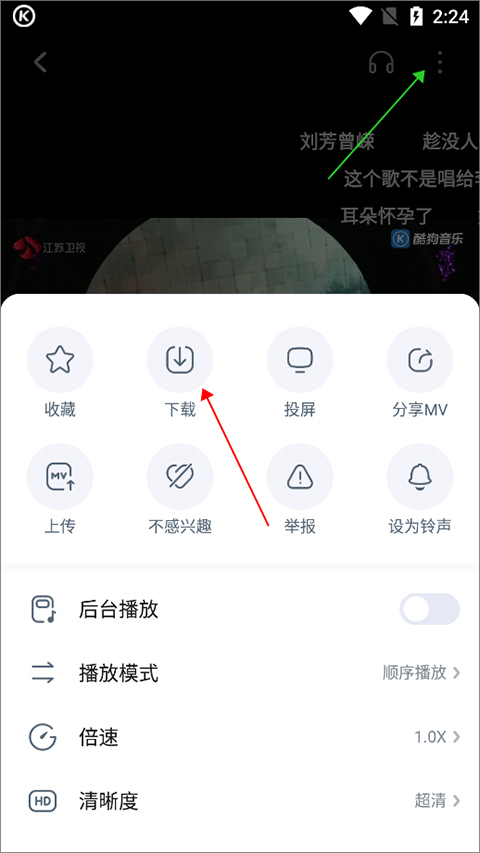 在观看mv时的页面中点击右上角的扩展图标(下图绿色箭头所指),在底部弹出的面板中点击【下载】(下图红色箭头所指),再mv下载到手机上