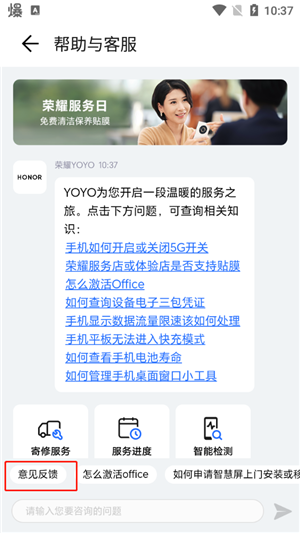 若您想要反馈产品使用过程中遇到的问题,又或是针对荣耀产品及服务提出优化建议,可通过路径“我的>设置>帮助与客服>意见反馈”,来反馈相关信息。