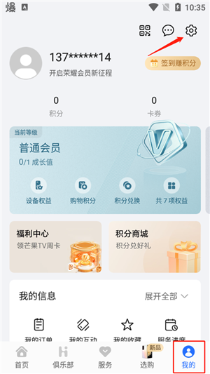 4、点击“我的”,能够查看设备权益、购物积分、积分兑换等权益,同时也能查看订单、互动、收藏等内容。