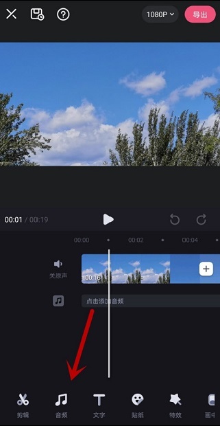 1、在必剪打开要录音的视频,点击【音频】选项。