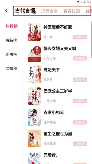 3、在排行榜中也可以看到各类小说的热搜榜、完结榜、新书榜和口碑榜;