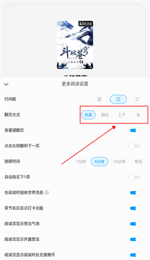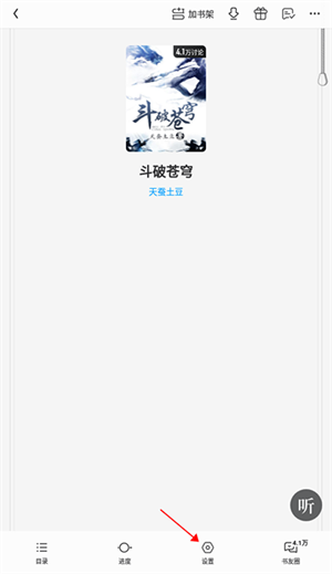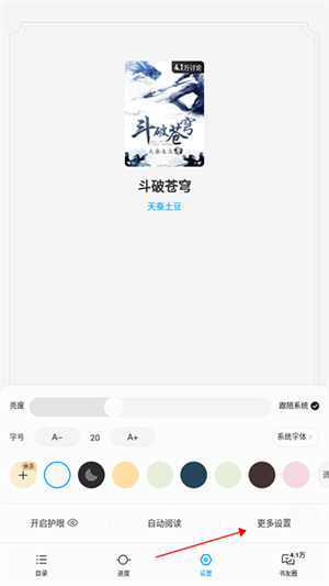 2、关闭自动购买下一章节:点击屏幕正中,在出现的导航栏下方点击“设置”功能,并点击右下角的“更多设置”看,可见到“自动购买下一章”的关闭按钮。
