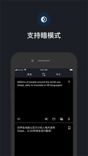 - 深色模式:在翻译的同时,保护眼睛免受强光干扰,节省电池寿命
