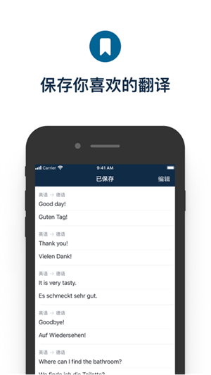 - 收藏翻译:点击书签图标,保存单词和短语以备将来参考,或创建你自己的词汇表(支持所有语言)