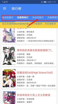 1、打开轻小说文库app,进入小说排行榜界面,左右滑动上方分栏可看到包括总点击排行、总推荐排行、月点击排行、月推荐排行等排行类型,用户可选择相应的类型,这里以【月点击排行】为例,
