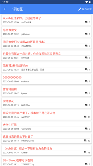 6、返回小说主页,选择右上角【对话框】图标可以进入小说的评论区,查看书友们的留言评论,帮助你更真实地了解这部小说,以上就是轻小说文库的使用方法了。