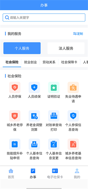 3、点击进入服务,其中包含电子社保卡、缴费工资申报、人员停保、人员新参保、人员续保等服务项目,同时还具备社保卡挂失、社保卡解挂、社保卡激活等功能。