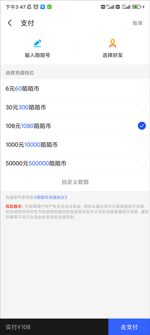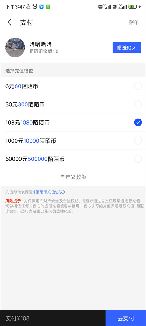 4、进行陌陌币充值操作时,进入到充值的下一步,就能看到一个蓝色的“赠送他人”按钮,通过这个按钮,我们就能为他人充值赠送陌陌币。