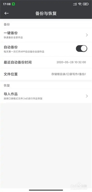 6.写好文章之后,一定要及时备份,只要备份文件还在,可以随时导入到APP中继续写,导入的格式是口袋的备份文件,以.kd结尾的。