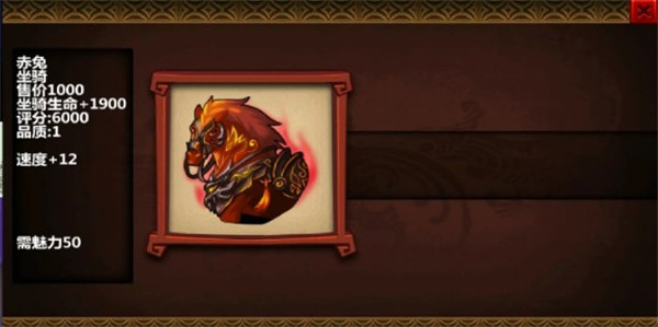 - 赤兔:在常规马匹里堪称最佳,速度为12,血量达1900。获取方式有在部分城中偶然遇到伯乐时可购买,或者通过抽奖获得。